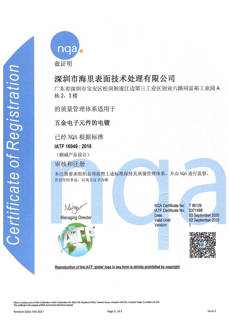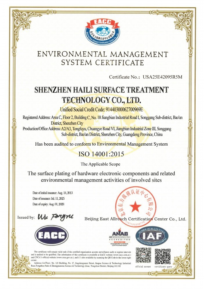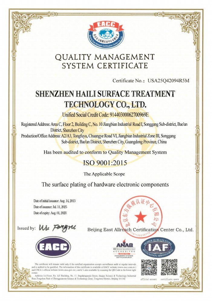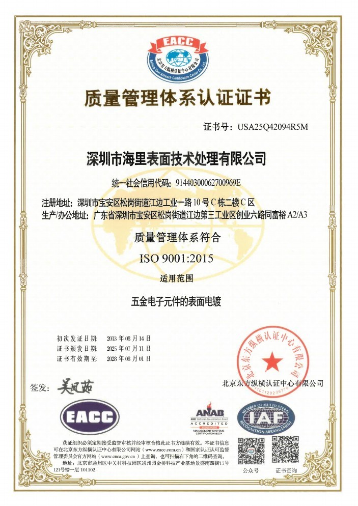 深圳市海里表面技術(shù)處理有限公司(下稱(chēng)海里)是一家專(zhuān)業(yè)從事高品質(zhì)五金電鍍來(lái)料加工企業(yè),公司創(chuàng)建于2004年10月,位于深圳市寶安區(qū)松崗鎮(zhèn)江邊第三工業(yè)區(qū)。承蒙客戶(hù)鼎力支持及同仁之努力,目前在板材及端子連續(xù)鍍金、銀、鎳、錫,精密五金件與特殊材料(如鎢銅、鉬銅、CPC及鋁碳化硅、陶瓷等)滾/掛鍍金、銀、鎳以及化學(xué)金、化學(xué)鎳等電鍍加工方面具備較高質(zhì)量水平,為部分知名國(guó)際及國(guó)內(nèi)企業(yè)的首選電鍍加工商。